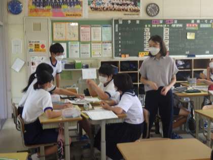 「日本語で分かっていてもなかなか英語で表現できない」、「単語は出てくるけど、しっかりとした分法で表現できない」などのつまづきに対して、ALTや教科担任がサポートに入ります。また、仲間のアドバイスもあり、ゲームを楽しみつつ、繰り返し基本文を練習していました。