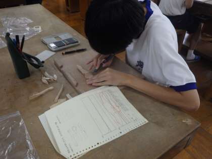 やさしいバターナイフづくりの加工の様子です。糸のこぎりで大きなカットを行ったと、彫刻刀でイメージどおりになるよう、細部にこだわって彫り進めていきます。