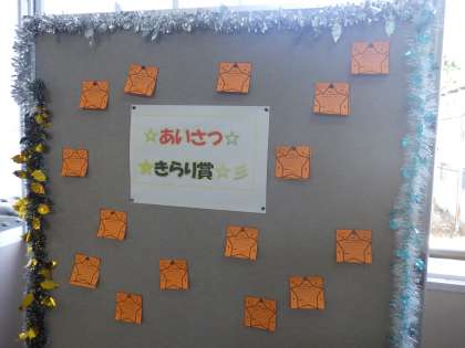 2階の廊下に掲示された「あいさつ きらり賞」。生活福祉委員会が中心となり、学校の雰囲気づくりのために貢献してくれています。