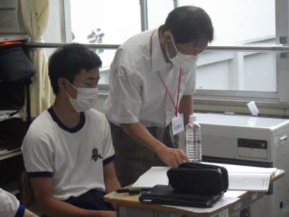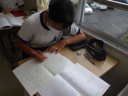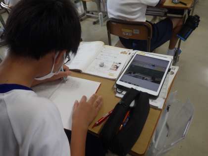 これまでに学習した方程式の問題を復習していました。たくさんの練習問題を決められた時間で正確に解いていきます。途中、解き方の解説が黒板に表示されると、一斉にタブレットを使って写真に収めていきます。時間を有効活用した現代の中学生の知恵を感じました。