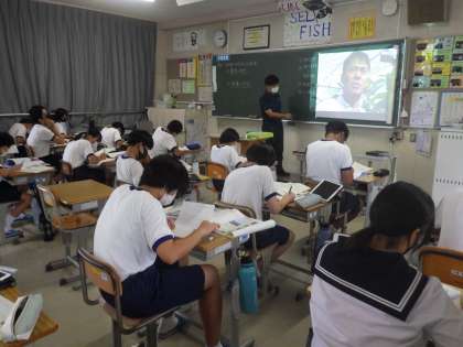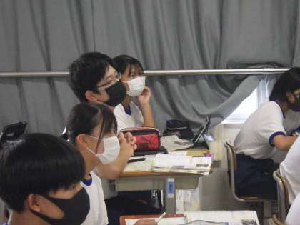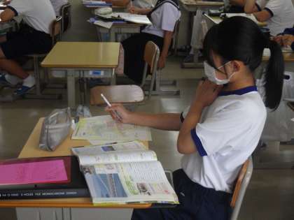 「中国・四国地方の産業」について学んでいました。他の地域で学んだことを思い出し、比較したり予想したりしていきます。また、映像などからわかることをどんどん発表していきます。テンポが非常によく、生徒たちが授業に引き込まれていく感じが伝ってきました。