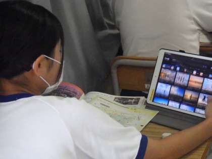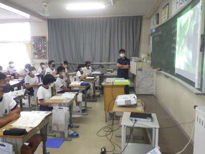 「中国・四国地方の産業」について学んでいました。他の地域で学んだことを思い出し、比較したり予想したりしていきます。また、映像などからわかることをどんどん発表していきます。テンポが非常によく、生徒たちが授業に引き込まれていく感じが伝ってきました。