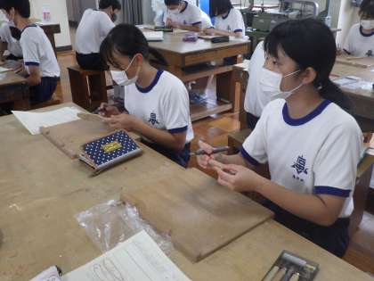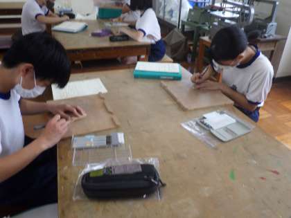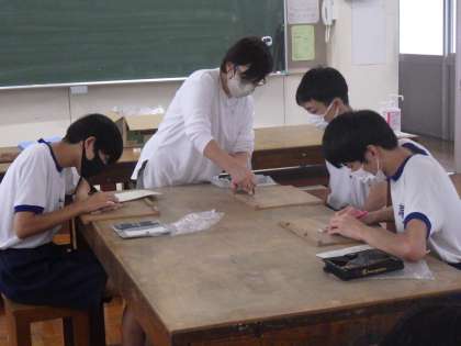 「やさしいバターナイフづくり」のいよいよ彫りの作業です。安全に留意しながら、イメージどおりの形に彫り進めています。