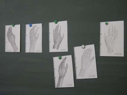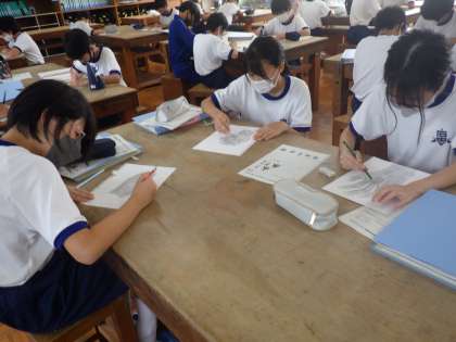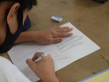 「12歳の手」をテーマにスケッチに取り組んでいました。自分の手をじっと見つめ、黙々と活動に取り組んでいます。