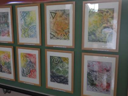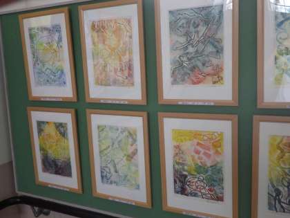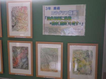 写真は、3年生によるコラグラフ版画の作品です。額に入れられ、作品の価値もさらに上がって見えます。