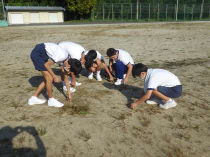 運動場の朝の草取りボランティア。環境美化委員会が始めたのをきっかけに、今では多くの生徒が朝の時間を使って活動を行ってくれています。