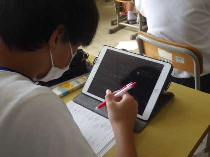 漢字の学習に取り組んでいました。これまで学習したものからたくさん出題されていました。答え合わせは各自が学習用タブレットを使って行っていきます。