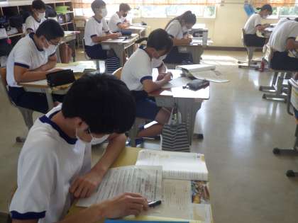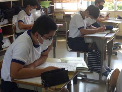 「過去分詞を使って人や物を説明しよう」をテーマに、学習が進められていました。今日はリーディングも少なめ。書く活動が中心でした。