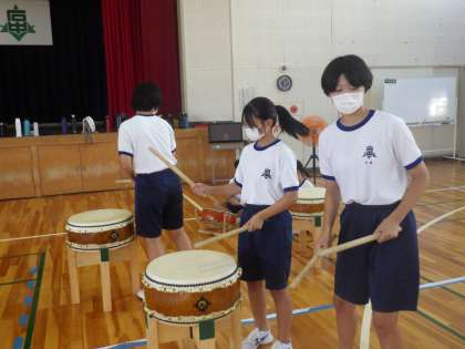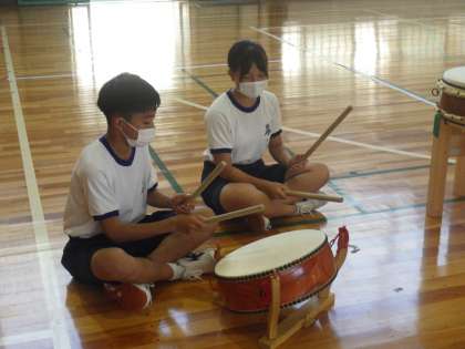 2週間ぶりに行われた全校アルペン(伝統芸能を学ぶ会)・「勘八太鼓」の様子です。全5回のうち、今回が2回目の会となります。