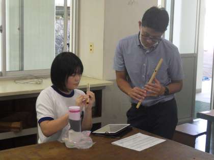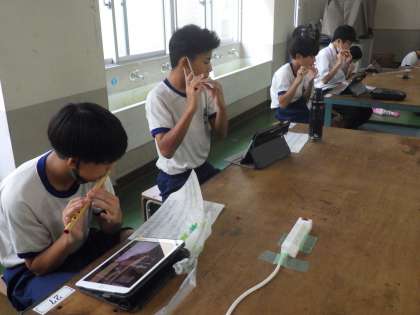 今日は楽器ごとに分かれての練習です。太鼓はビデオを見ながら全員で、笛は楽譜や学習用タブレットの映像で指使いや音を聞きながら練習していました。