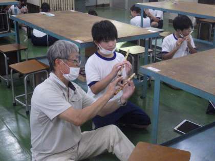 今日は楽器ごとに分かれての練習です。太鼓はビデオを見ながら全員で、笛は楽譜や学習用タブレットの映像で指使いや音を聞きながら練習していました。