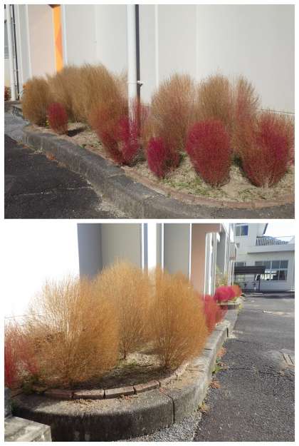 体育館南側の花壇に植わるコキア。赤色から黄金色に変わりつつあります。この色になると、いよいよ今年のコキアも見納めになります。ただ、目には見えませんが、その付近の土には今年のコキアの種が落ち、来年もまたきれいな色の変化を楽しませてくれる準備が始まっています。