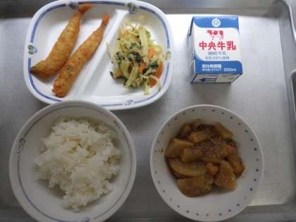 今日の献立は、だいこんとさといものそぼろ煮、ごまあえ、ししゃもフライ、ごはん、牛乳 でした。  エネルギー:821kcal