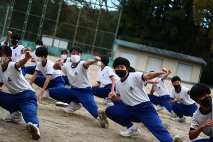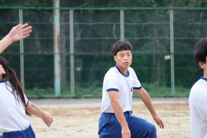 写真は、運動場で行われていたソーランの朝練習の様子です。