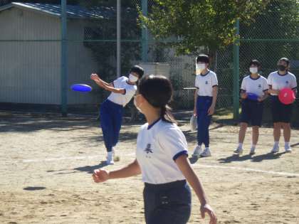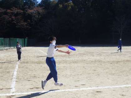 アルティメットの学習です。今日は、ロングパスから得点する練習をゲーム前に行っていました。男女問わず、思いっきり走り、思いっきりディスクを飛ばし、難しい場所でもしっかりと走り込んでキャッチしようと努力しています。全員が生き生きと活動している様子に見とれてしまいました。