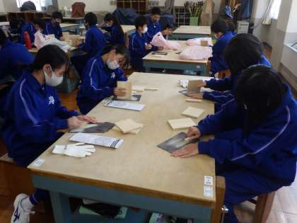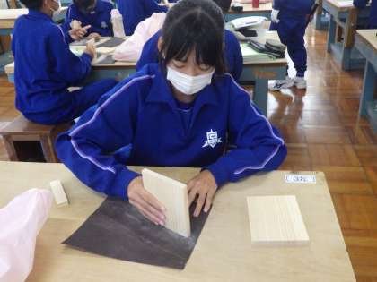 木材加工製品づくりで、今日は「面取り」の工程に入っていました。接着する面がきれいにつくように、丁寧にやすりで磨き上げていきます。一心不乱にやすりがけをしていました。