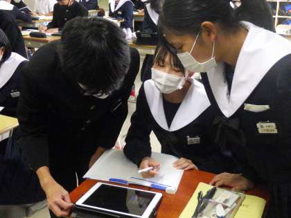 ものを比較する文法の学習のために、アンケート結果の分析を活用しようとしています。今日はその元となるアンケートの内容を考えていました。どんな質問にすると比較できる結果になるのか、仲間や教科担任のアドバイスをもらっていました。