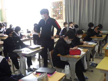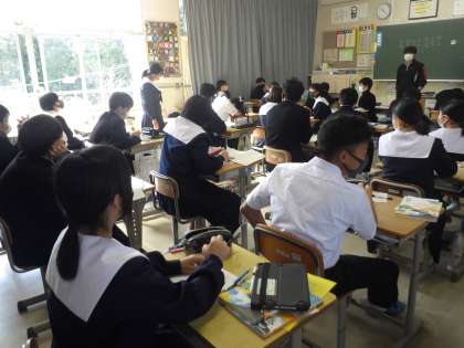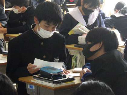 平家物語の現代語訳の学習に取り組んでいました。表現の様々な技法(擬人法・直喩・隠喩・体言止め・対句・倒置・反復など)に意味を確認しつつ、その表現を探していました。細かな見分け方を活発に議論している様子が印象的でした。
