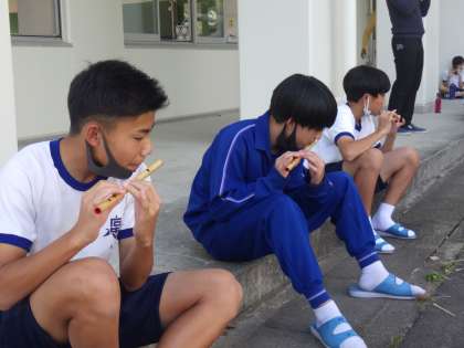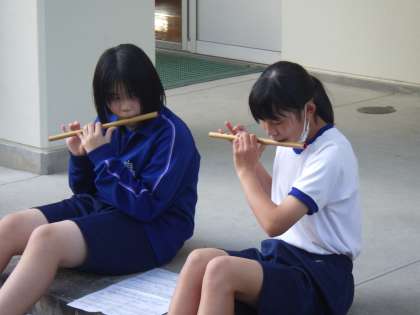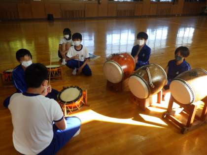午後に行われた全校アルペン(伝統芸能を学ぶ会)。今年度の活動もいよいよ最終回を迎えました。写真は、水神囃子の活動の様子です。