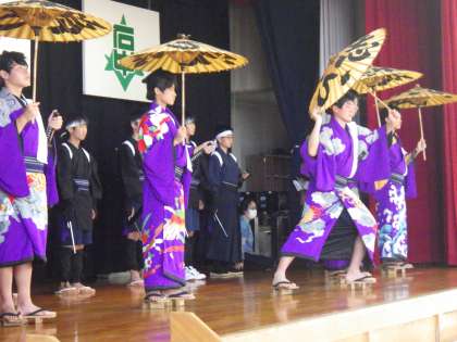 午後に行われてた全校アルペン(伝統芸能を学ぶ会)の最終回・石野歌舞伎の活動の様子です。