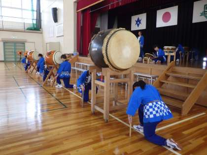 午後に行われてた全校アルペン(伝統芸能を学ぶ会)の最終回・勘八太鼓の活動の様子です。