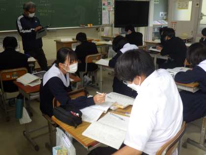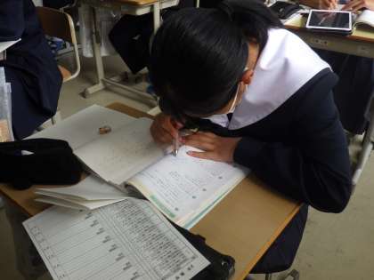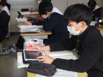 一次関数の演習問題に取り組んでいました。教科書に記されたQRコードをタブレットで読み取ると、丁寧な解説が表示されます。このおかげで、一人での学習の効率が飛躍的に伸びています。ただ、答えを導き出せても「解説の意味が分からない」という生徒もおり、教科担任が一人ずつ丁寧に対応していました。