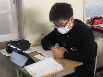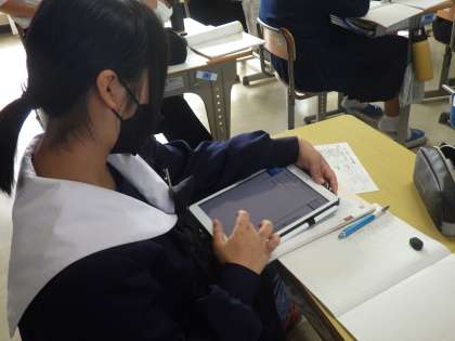 一次関数の演習問題に取り組んでいました。教科書に記されたQRコードをタブレットで読み取ると、丁寧な解説が表示されます。このおかげで、一人での学習の効率が飛躍的に伸びています。ただ、答えを導き出せても「解説の意味が分からない」という生徒もおり、教科担任が一人ずつ丁寧に対応していました。