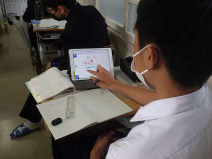 一次関数の演習問題に取り組んでいました。教科書に記されたQRコードをタブレットで読み取ると、丁寧な解説が表示されます。このおかげで、一人での学習の効率が飛躍的に伸びています。ただ、答えを導き出せても「解説の意味が分からない」という生徒もおり、教科担任が一人ずつ丁寧に対応していました。