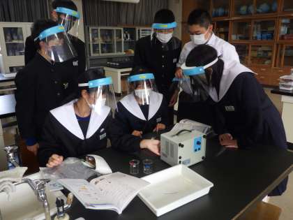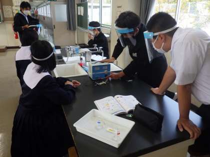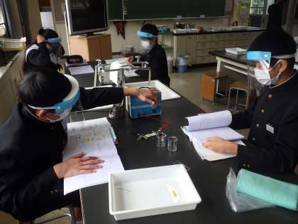 「酸・アルカリとイオン」の単元で、電圧を加えてpH試験紙につけた色がどのように変化するかを確かめる実験が行われていました。安全かつ手際よく進められていた実験の様子を見て感心しました。