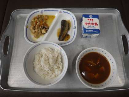 今日の献立は、さといものみそ汁、きのこごはん(麦ごはん)、いわしのしょうが煮、牛乳 でした。  エネルギー:803kcal