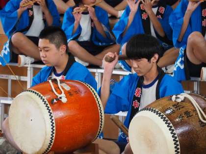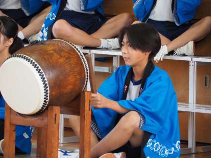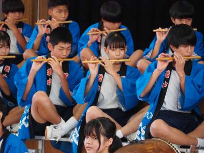 写真は、午後に本校体育館で行われた石中祭「水神囃子」の発表の様子です。