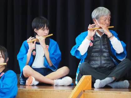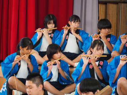 写真は、午後に本校体育館で行われた石中祭「水神囃子」の発表の様子です。