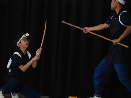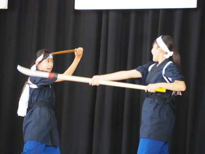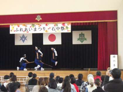 写真は、午後に本校体育館で行われた石中祭「棒の手」の発表の様子です。