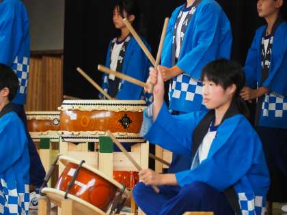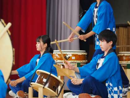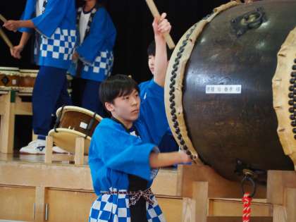 写真は、午後に本校体育館で行われた石中祭「勘八太鼓」の発表の様子です。