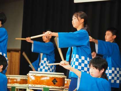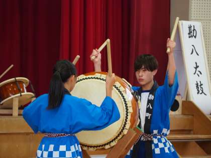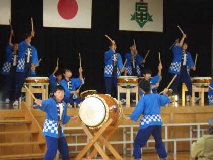 写真は、午後に本校体育館で行われた石中祭「勘八太鼓」の発表の様子です。