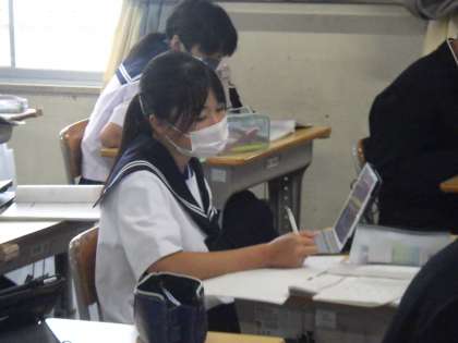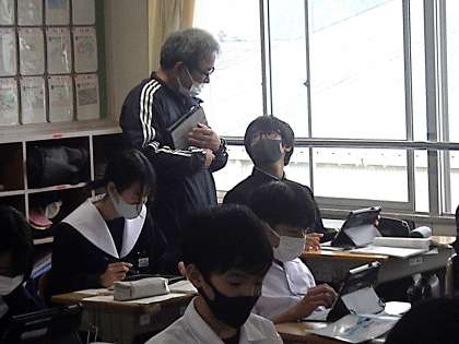 反比例の式の求め方について学習していました。黒板を使って全体での学習のあとは、学習用タブレットを用いてQubenaで学習です。途中の計算をしっかりと書く生徒がいたり、解答の確認ボタンを押すときに拝んでいる生徒もいました。