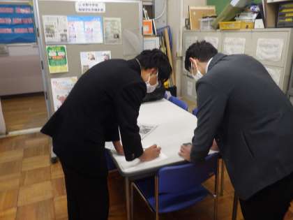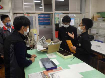 4組の生徒たちが、サツマイモの販売のために職員室にやってきました。職員室では行列ができるほどの大盛況。