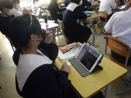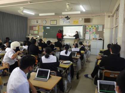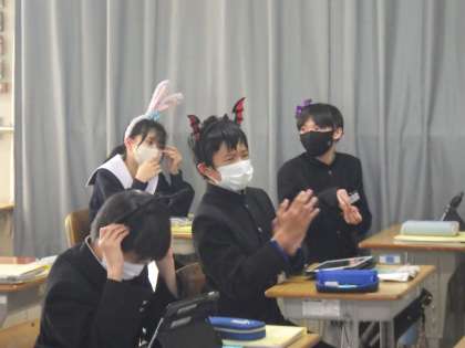 写真をよく見ていただくとお分かりのように、生徒それぞれがカチューシャをつけて、ハロウィンの雰囲気を味わいながら授業に参加しています。ALTの粋な計らいにより、たいへん盛り上がった授業でした。