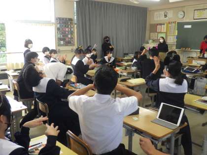 今日は、ALTとのコミュニケーション活動の日でした。グループ対抗のゲームを通して、これまで学習してきたことを発表していきます。