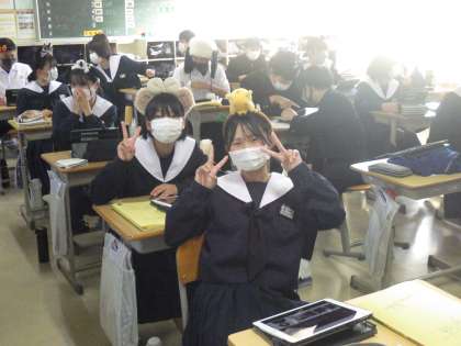 写真をよく見ていただくとお分かりのように、生徒それぞれがカチューシャをつけて、ハロウィンの雰囲気を味わいながら授業に参加しています。ALTの粋な計らいにより、たいへん盛り上がった授業でした。