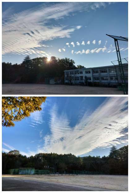 秋らしい雲が浮かぶ朝の空。メタセコイヤの木の下から撮影した写真です。今日も一日、良い天気になりそうです。