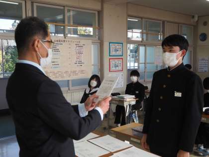代表生徒から、「まもなく後期中間テストです。努力の成果をしっかりと発揮できるよう、健康には十分注意していきましょう」と頼もしい言葉が述べられました。