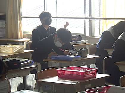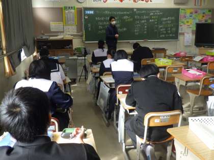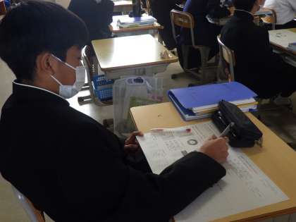 「アマゾンの開発はどのようにして行われてきたのか」を課題に、学習に取り組んでいました。教科担任が用意した学習プリントに黒板の内容だけでなく、話している内容もメモしていっています。目で見て、耳でよく聞いて授業に臨んでいる様子が伝わってきました。