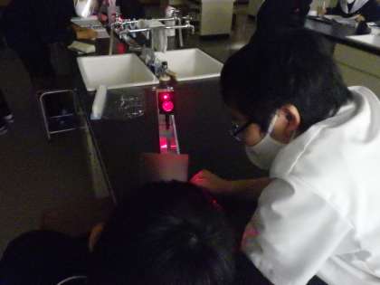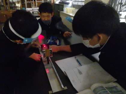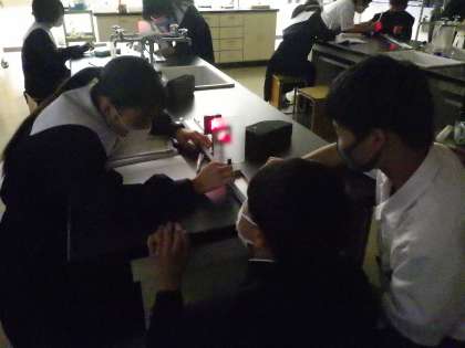 凸レンズの像を確かめるための実験が行われていました。実験器具を正確に操作し、仲間と協力して結果を確認していっています。(画像が暗いのは、理科室を暗転にしているためです。見にくくれ申し訳ありません)