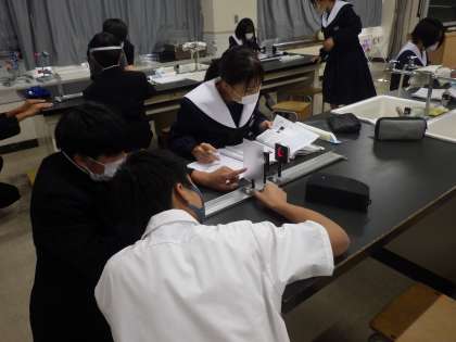 凸レンズの像を確かめるための実験が行われていました。実験器具を正確に操作し、仲間と協力して結果を確認していっています。(画像が暗いのは、理科室を暗転にしているためです。見にくくれ申し訳ありません)