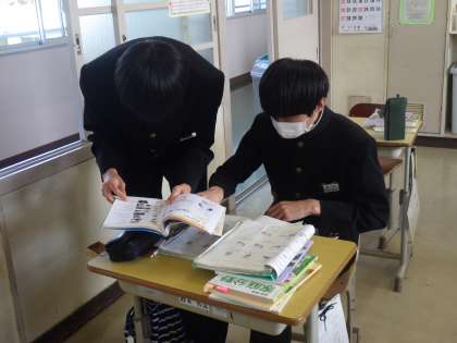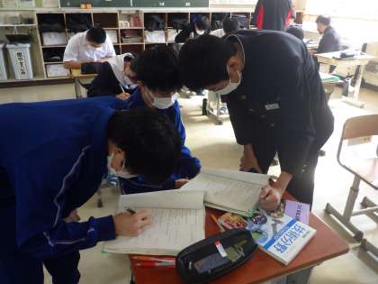 製図の描き方で、キャビネット法を学習していました。後期中間テストにも出題されるとあって、友達のものを写すのではなく、自力で描けるようにしていました。