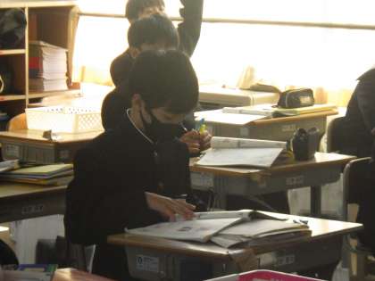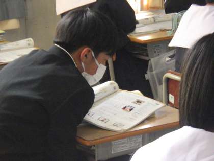 代名詞について学んでいました。教科書に掲載されている人物などを興味深げに見ています。学習の本題に入る前の興味付けも教科担任の工夫の一つです。