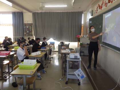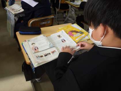 代名詞について学んでいました。教科書に掲載されている人物などを興味深げに見ています。学習の本題に入る前の興味付けも教科担任の工夫の一つです。