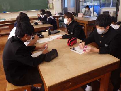 新型コロナウイルスやインフルエンザウイルスへの感染を予防するため、どんな取組が有効か、その取組をどう全校生徒に浸透させていくかを話し合っていました。特に3年生にとっては受験を控えたとても大切な時期になります。全員が元気に登校できるよう、知恵を出し合ってくれる委員会の生徒たちに感謝です。
