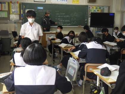 「合同な三角形の条件」について学んでいました。多くの生徒が覚えたかを発表していきます。疎覚え(うろおぼえ)でも積極的に発表に挑戦していく姿に感心しました。
